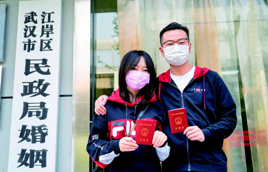 4月7日,在武汉市江岸区民政局婚姻登记处,陈先生与张女士展示结婚证。