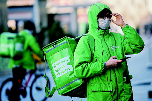 ▲4月7日,在俄罗斯首都莫斯科,送餐员等待取餐。据俄罗斯防疫指挥部网站7日通报,过去24小时俄新增确诊病例1154例。新华社发(叶甫盖尼·西尼岑摄)