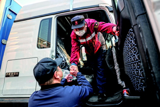 4月13日,驰援黑龙江省绥芬河市的工作人员(右)与同事告别。