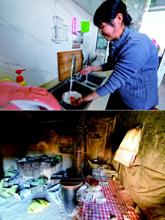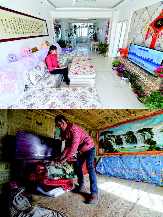 拼版照片:上图为胥存坐在古浪县绿洲生态移民小城镇的家中客厅看电视(3月10日摄);下图为胥存在古浪县黄羊川镇石城村收拾屋中物品(2018年2月6日摄)。 |