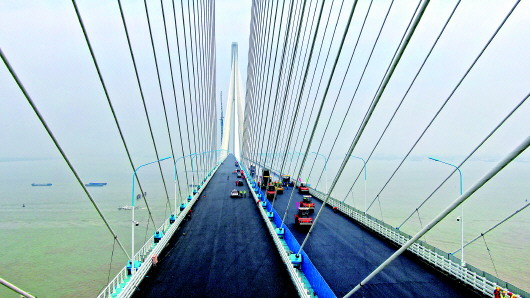 4月14日,由中铁大桥局承建的沪通长江大桥主航道桥桥面沥青摊铺全部完工。