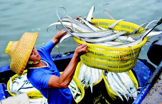 ▲4月18日,海南省琼海市潭门港的渔民在码头卸运海鱼。随着海南渔业陆续复工复产,每日清晨,大批满载而归的渔船返回琼海市潭门港码头卸货,码头上一派繁忙景象。 新华社发(蒙钟德摄)