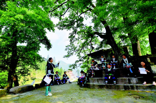 ▲在党鸠村桂黔乌英苗寨大枫树下,梁孟香在培训公开课上讲课(4月16日摄)。 |