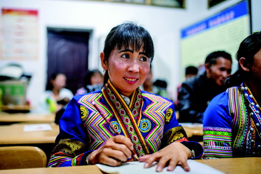 4月10日,在云南省勐海县布朗山乡曼囡村曼班三队,娜四在村里上夜校。