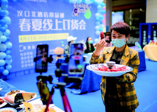 ▲4月23日,商户在直播销售自家的餐盘。当日,武汉汉口北春夏电商直播采购节开幕,汉口北市场内众多商户一改往日的坐店待客模式,纷纷移步线上,变身“主播”推介产品。据介绍,面对疫情对实体经济带来的冲击,汉口北市场依托自有的电商直播产业基地平台,引入50余家产业互联网平台、电商平台和直播机构资源,积极引导商户开展线上营销、线上无接触交易,有效带动线上批发交易和零售销售。 新华社记者肖艺九摄