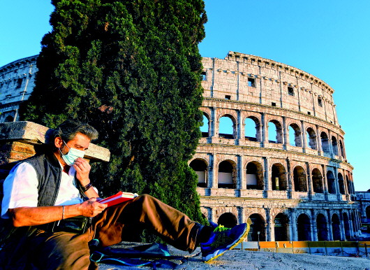 4月26日,一名戴着口罩的男子在意大利首都罗马的斗兽场附近看书。