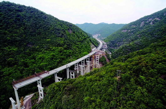4月28日,建设者在昆楚高速公路岔河特大桥上施工。岔河特大桥全长2.06公里,山高坡陡,桥隧相连,目前施工进展顺利。 新华社记者杨宗友摄