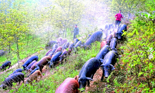 4月28日,周红珍(右)与哥哥一起赶着母猪和猪崽上山。 |