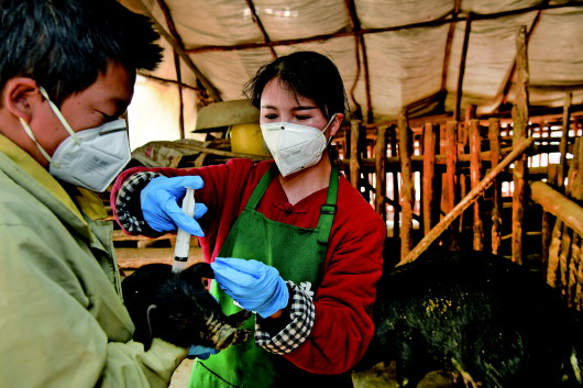 周红珍(右)由哥哥周红山配合,给猪崽打疫苗(4月27日摄)。 |