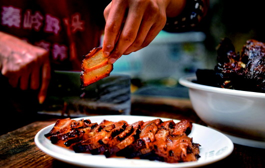 周红珍用蒸熟的腊肉招待慕名而来的客人(4月27日摄)。 |