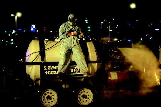 4月28日,在约旦安曼,工作人员给一处车站消毒。约旦新闻事务国务大臣兼政府发言人阿姆贾德·阿达莱日前表示,约旦公共交通系统将从29日起恢复50%运力以配合已复工企业。 新华社发(穆罕默德·阿布·古什摄)