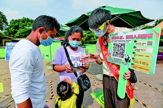 ![]() 4月30日,广州长隆野生动物世界的工作人员在门口指引游客出示健康码。 当日,广州长隆野生动物世界恢复开放。动物园实施线上预约、健康登记、实名入园、体温监测等多项管理措施。 新华社记者刘大伟摄 |