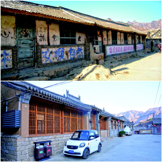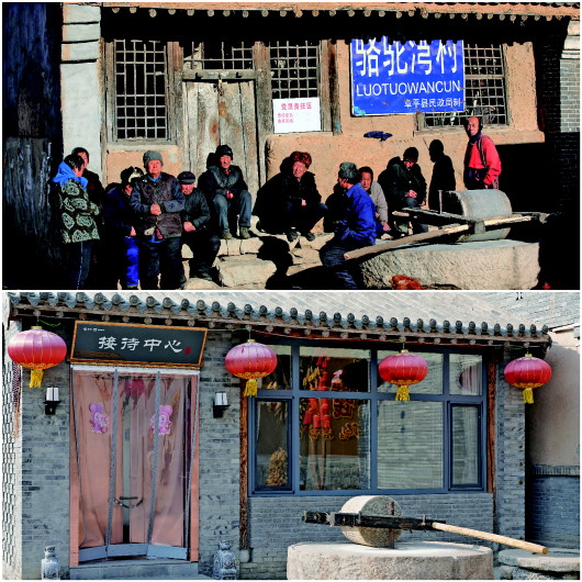 ![]() 拼版照片:上图,骆驼湾村村民们冬天在村头广场晒太阳(历史照片);下图,被改造成游客接待中心的广场房屋(4月28日摄)。本报记者陈旭摄 |