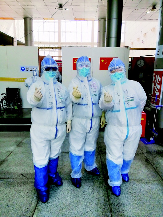 时秋(右一)与医疗队队员们穿戴好防护用品,成为了坚守在武汉江岸方舱医院“红区”的白衣战士。(2月18日摄,受访者供图) |