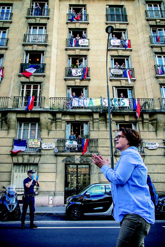 5月2日晚,在法国巴黎附近的圣芒代,居民们为医护人员鼓掌。当晚8时左右,圣芒代一栋居民楼的住户们在自家窗外挂上法国国旗以及自制标语牌,上面写着“晚8点”“爱”“感谢英雄”等,向奋战在一线的医护人员致敬。 新华社发(奥雷利安·莫里萨尔摄) |