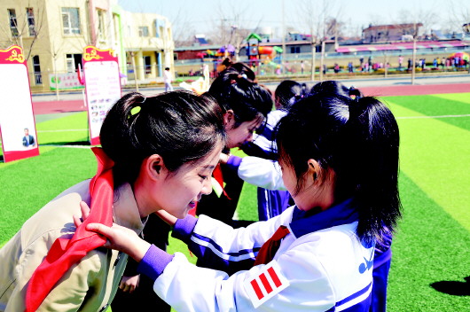 汤池镇中心小学学生为高潘(左)系红领巾。 (受访者供图) |