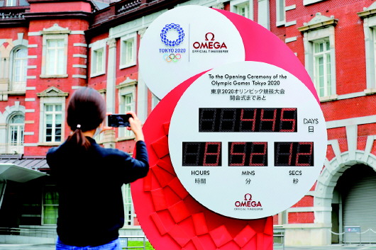 ◤五月四日,一名女子在日本东京车站前拍摄东京奥运会的倒计时电子钟。