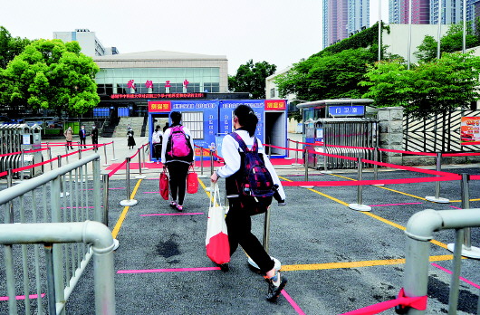 ▲5月6日,武汉市武钢三中的学生有序进入校园。当日,湖北省普通高中毕业年级(含中职学校和技工学校的毕业年级)学生统一开学。 新华社发(王永胜摄)
