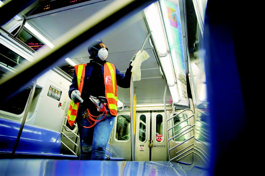 ▲5月6日,在美国纽约,地铁工作人员对地铁车厢进行消毒。6日起,为应对新冠疫情,原本24小时运营的纽约地铁开始在每天凌晨1点到5点暂停运营,对车辆进行全面消毒。 新华社发(郭克摄)