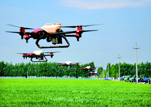 5月7日,在山东青岛平度市蓼兰镇胜利村,植保无人机在进行小麦条锈病防治喷洒作业。