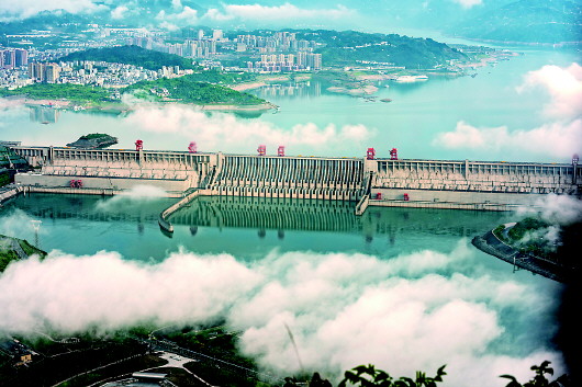 5月10日上午拍摄的三峡大坝(无人机照片)。一场大雨过后,三峡大坝上空云雾蒸腾,美不胜收。 新华社发(郑家裕摄)
