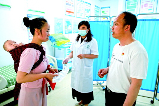 罗应和(右)在贵州惠水县的“移民社区医院”内与群众交谈(5月6日摄)。