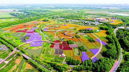 江苏宿迁三台山森林公园衲田花海,由612块花田拼接而成,形成“缀衲百花色,披就福田衣”的独特景观。 新华社记者韩瑜庆摄