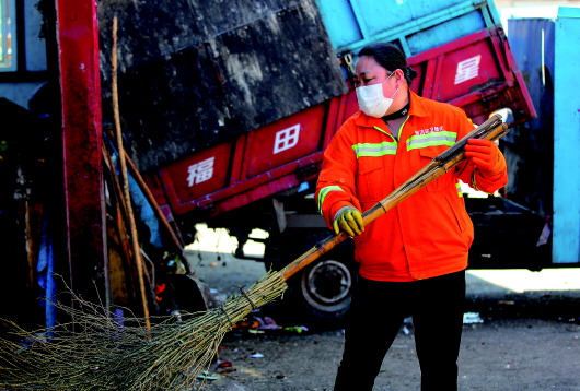 庄艳在鞍山市立山区的道路上清扫垃圾。
