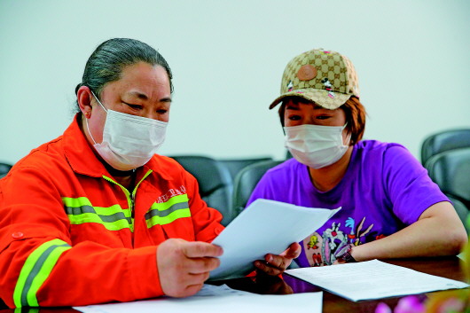 庄艳(左)在工作单位接待来访群众(5月11日摄)。