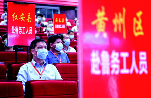 5月14日,即将赴鲁就业的湖北务工人员在湖北黄冈参加《鄂鲁支持贫困劳动力外出务工暨劳务协作帮扶协议》签约仪式。新华社记者程敏摄 |