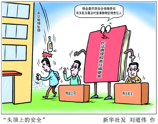 对于近年来社会各界高度关注的高空抛物坠物问题,侵权责任编草案在现行侵权责任法规定的基础上,为保护老百姓“头顶上的安全”作出更有针对性的规定,明确物业要尽到安全保障责任,有关机关要及时查清抛物坠物责任人。