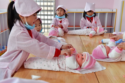 二〇一九年十二月五日,迁安市光彩幼儿园惠安分园的小朋友在园内职业体验区玩耍。近年来,河北省迁安市不断推进普惠性幼儿园建设。新华社记者牟宇摄