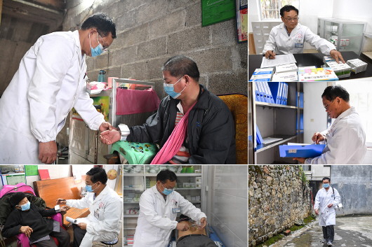 这是一张拼版照片。上左及上右:黄日雷为村民量血压。下中:为村民拔火罐。上右:核对药品明细。