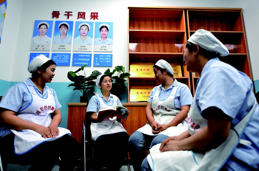 ▲5月13日,何菲(左二)在活动室与同事们交流。全国人大代表何菲是陕西省咸阳纺织集团有限公司一分厂的纺织工人。她2005年参加工作,现为“赵梦桃小组”第十三任组长。在抗击新冠肺炎疫情过程中,何菲带领工友坚守在复工复产一线,抢抓工时完成生产任务。她表示,要在新时代继续传承发扬好“梦桃精神”,为纺织行业高质量发展贡献力量。 新华社记者张博文摄