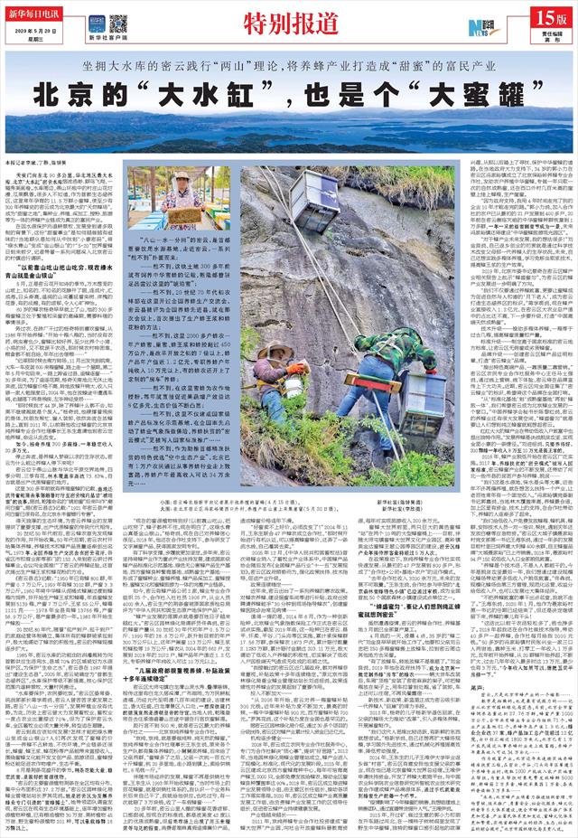 天安门向东北90多公里,华北地区最大水库、北京“大水缸”密云水库烟波浩渺、群鸟飞翔,一幅秀美画卷。水库周边,燕山环抱中的村庄山花烂漫、瓜果飘香。很多人不知道,作为首都生态涵养区,这里常年孕育的11.5万群小蜜蜂,使至少有300年养蜂史的密云成为北京最大的“天然蜂场”,成为“甜蜜之地”,集种业、养殖、深加工、授粉、旅游等为一体的养蜂产业链成为真正的富民产业。
