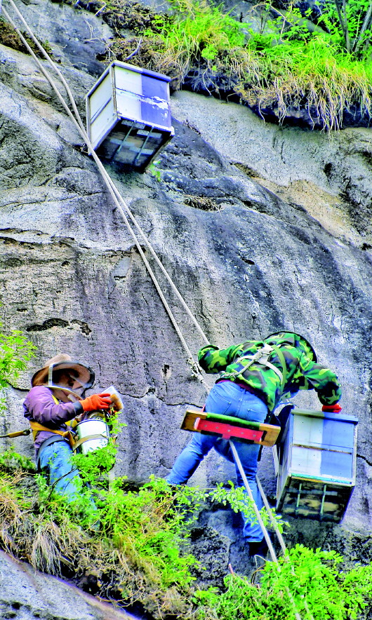 在北京密云区冯家峪镇西口外村,养殖户在山崖上采集崖蜜(5月20日摄)。 新华社发(李欣摄) |