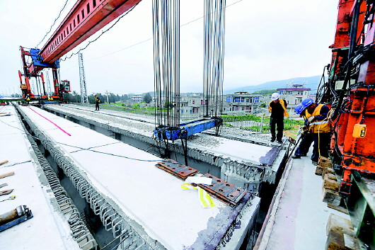 5月20日,工人在位于福建平潭的福平铁路洋中特大桥架设最后一片T型梁,标志着福平铁路架梁工作正式完成。 新华社记者林善传摄