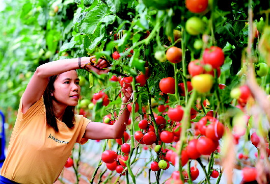 5月12日,在广西环江毛南族自治县川山镇塘万村大棚果蔬种植基地,当地村民在采收西红柿。 |