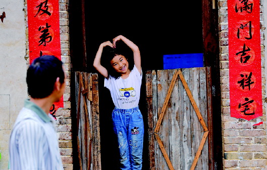 女儿盘语欣向刚回到家的父亲盘文明问好(4月17日摄)。 |