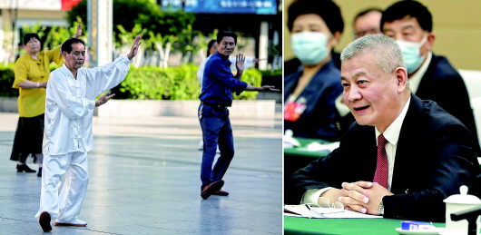左图:太极气功爱好者在湖南省安乡县长鹰广场晨练(5月12日摄)。