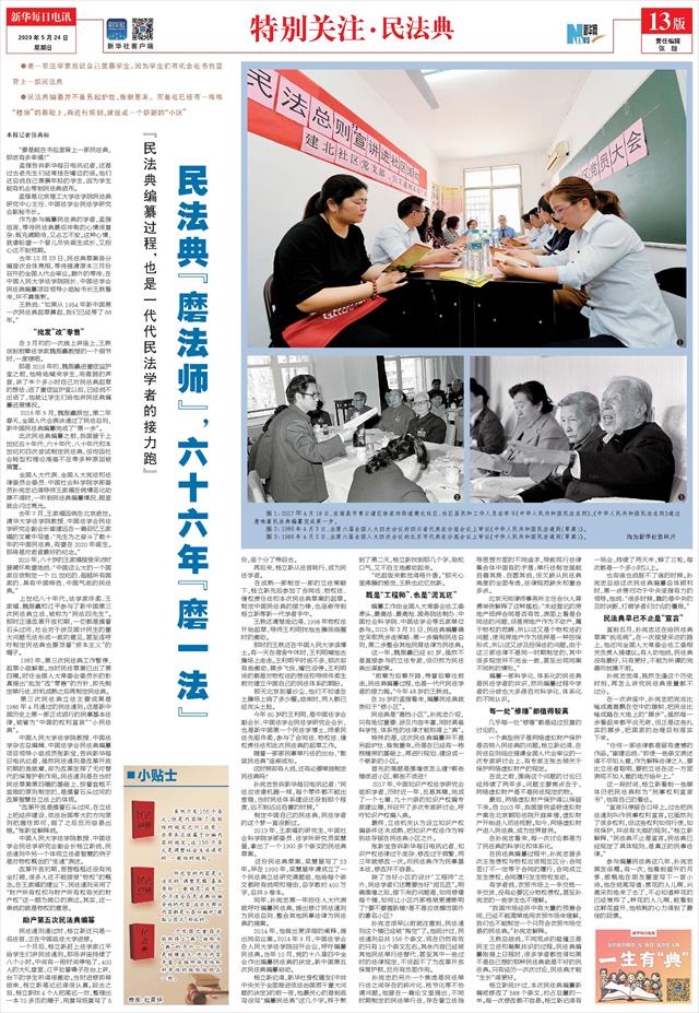 “前辈为后辈开路,带着后辈往前走。民法典编纂过程,也是一代代民法学者的接力跑。”今年48岁的王轶说。