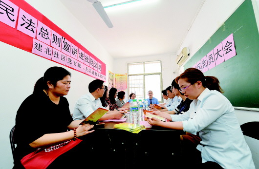 2017年4月18日,在南昌市青云谱区徐家坊街道建北社区,社区居民和工作人员在学习《中华人民共和国民法总则》。《中华人民共和国民法总则》通过意味着民法典编纂完成第一步。