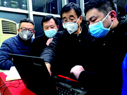 2月4日凌晨,胡豫(左二)与全国政协委员、中国医学科学院院长王辰(左三)等研究江汉方舱医院的建设工作。