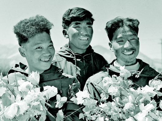 ▲1960年6月7日,人类历史上首次从北坡登顶珠峰的中国登山队队员王富洲(右)、贡布(中)与屈银华三人凯旋拉萨后捧花合影。 |