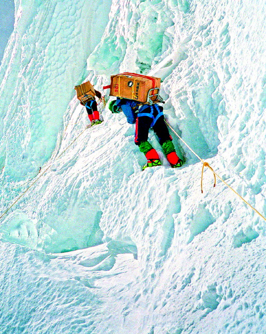 ▲1988年5月5日,中日尼联合登山队实现珠峰南北双跨。图为登山队队员在向峰顶挺进途中。 |