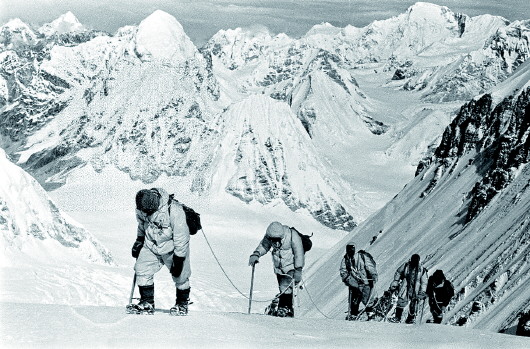 ▲这是1960年5月,中国登山队队员在海拔7150米的冰雪坡上行进。 |