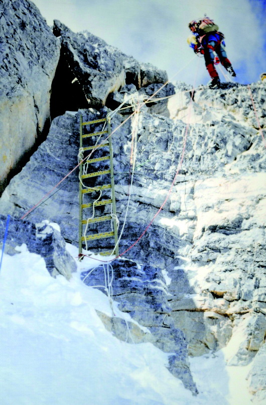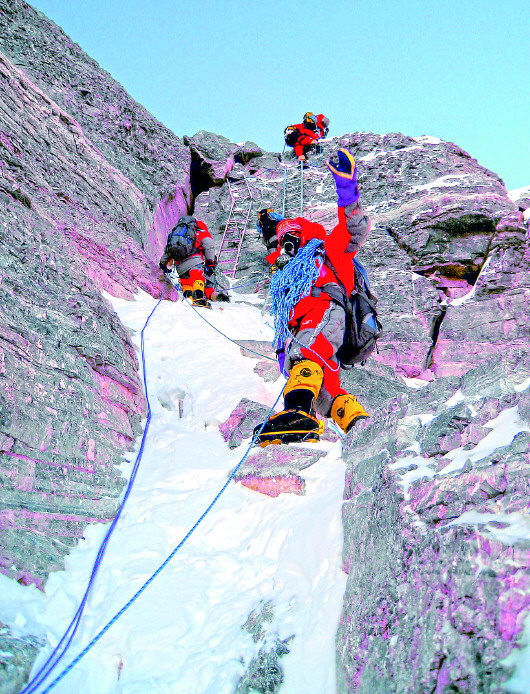 ▲2008年5月27日,登山队员通过架设在海拔8700米珠峰第二台阶的“中国梯”向上攀登。