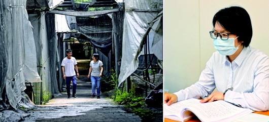左图:5月17日,耿新翠(右)与香菇种植户交流经验。 新华社记者刘坤摄