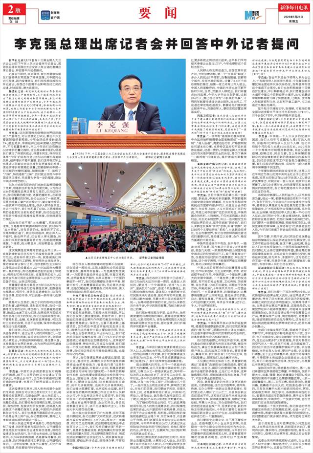 新华社北京5月28日电十三届全国人大三次会议28日下午在人民大会堂举行记者会,国务院总理李克强应大会发言人张业遂的邀请出席记者会,并回答中外记者提问。