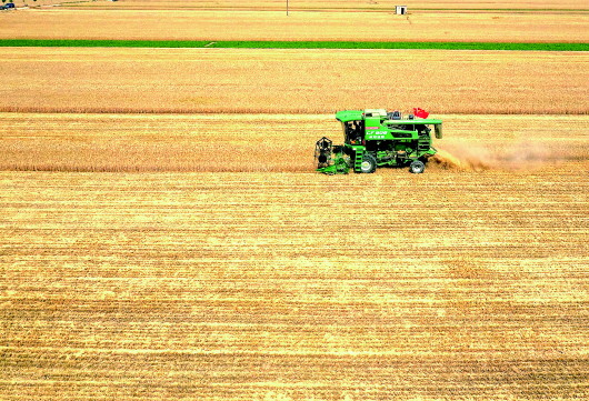 王连杰在操作收割机收获小麦(5月27日摄,无人机照片)。 |